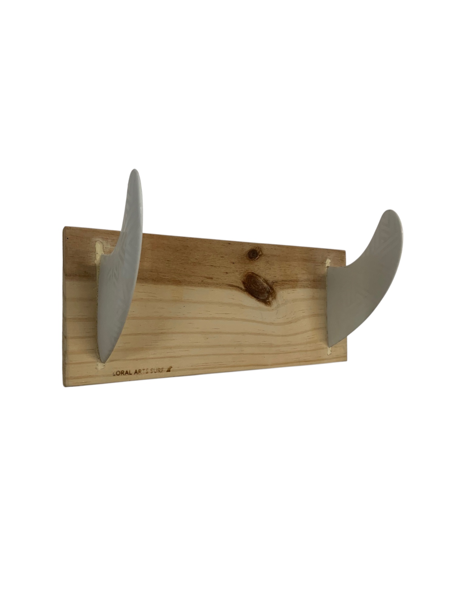 Cabide feito de madeira sustentável com duas quilhas de surf brancas reaproveitáveis. Vem com dois ganchos para pendurar na parede.